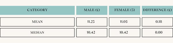 The mean hourly pay for male employees is £11.23, while for female employees, it is £11.05, resulting in a pay gap of £0.18. The median hourly pay for both genders is identical at £10.42, indicating that the central point of earnings distribution is equal.