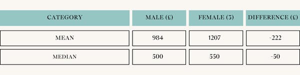 The mean bonus pay for male employees is £984, while female employees receive a higher average bonus of £1,207, resulting in a positive gap of £222. The median bonus is slightly higher for female employees at £550, compared to £500 for males, showing a £50 gap.
