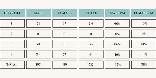The lower quartiles (Q1 & Q2) consist mainly of minimum-wage roles, whereas higher quartiles (Q3 & Q4) include senior-level or head office positions.