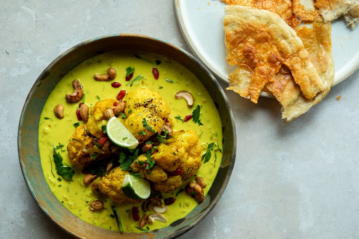 Plate the cauliflower in a deep serving dish and pour the moilee sauce over it. Scatter the toasted cashews on top and finish with some fresh coriander and lime wedges on the side. This dish is also great served with coconut rice.